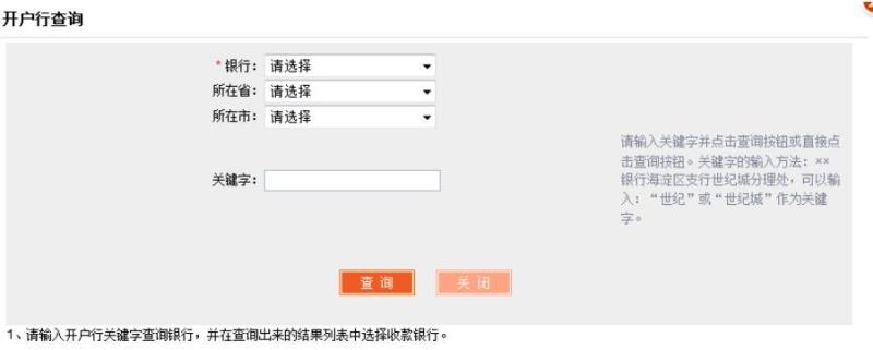 步驟二:選擇相應(yīng)的銀行開戶行、所在省、所在市,可以通過關(guān)鍵字查詢