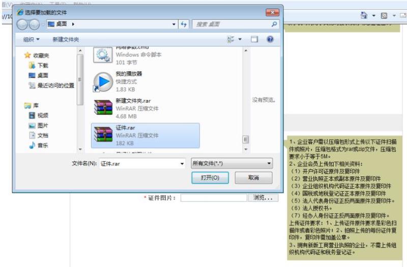 步驟二:點擊“瀏覽”,上傳證件圖片,圖片格式需以壓縮包形式上傳,壓縮包格式為rarzip文件,要求小于等于5M,如圖: