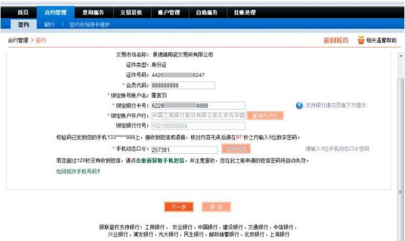 輸入會員在該交易市場的會員代碼、綁定銀行卡號、開戶行、動態(tài)口令,點擊“下一步”如圖: