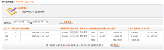通過該頁面可以查詢到商品已申購成交的情況,包括對應商品中簽的數(shù)量、成交價格、申購類型、成交金額、發(fā)行服務費等信息。