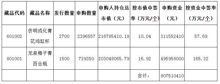 本次中簽分配方式按持倉市值優(yōu)先分配規(guī)則,請(qǐng)廣大參與申購的投資會(huì)員關(guān)注交易賬號(hào)中持倉數(shù)量和資金變化情況。《仿明成化青花雞缸杯》、《龍泉梅子青百合瓶》將于2016年9月26日正式掛牌交易。