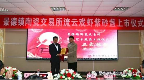 景德鎮陶瓷交易所董事何政谷為上海龍英藝術品投資有限公司頒發了藏品證書