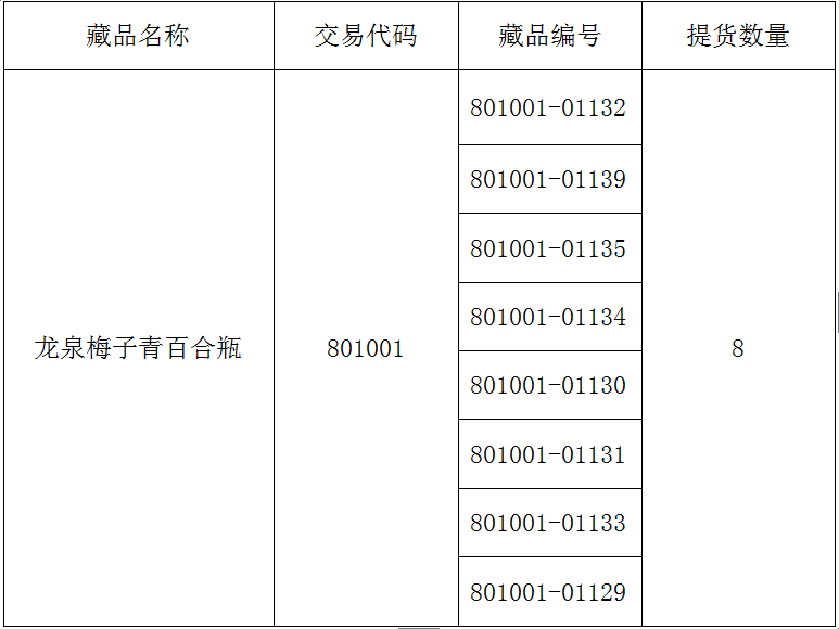 2018009關于交易藏品《龍泉梅子青百合瓶》提貨公告